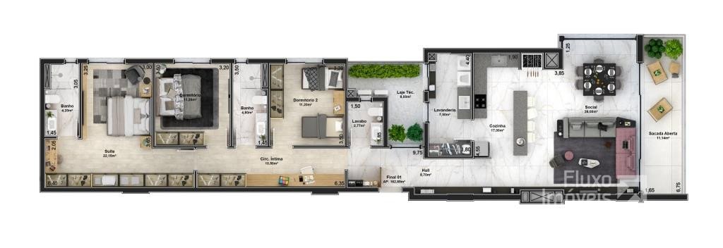 Apartamentos de alto padrão, com 89,58m², 96,67, 162,53 e 162,89m² privativos de 02 e 03 dormitórios respectivamente que englobam as características abaixo:
