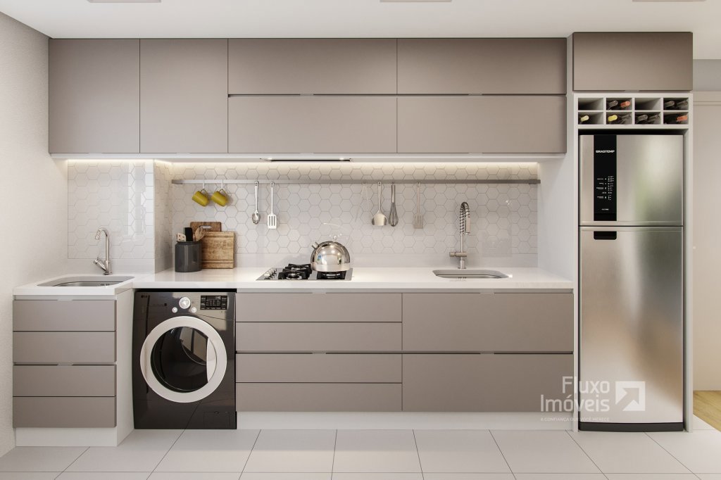 * Piso cerâmico na cozinha, na lavanderia, no banheiro e na sacada;