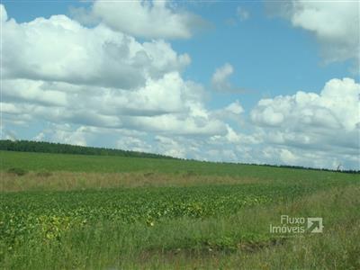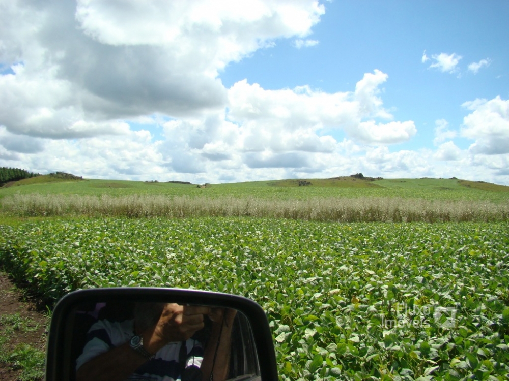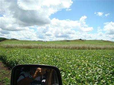 Descrição › Área de terras com 140h, composta por 70h de lavoura de soja plantada e 60h com pinus taeda com 12 anos. Frente para o asfalto.